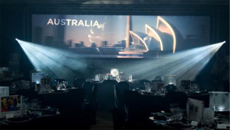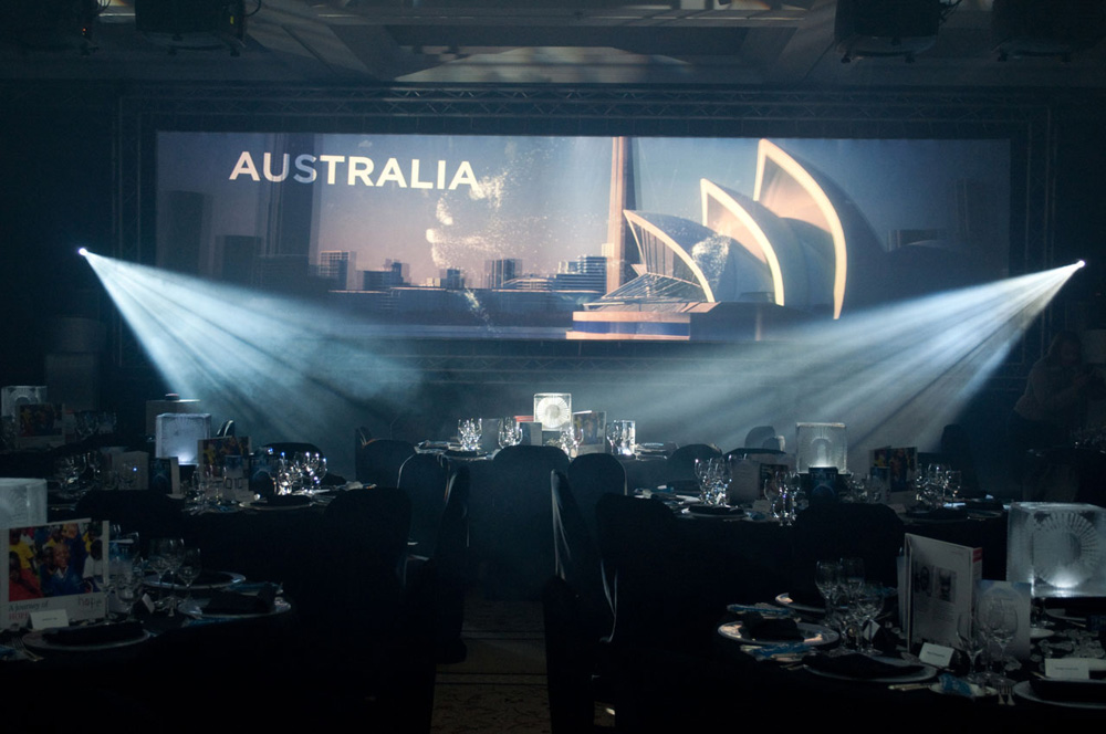 Provision of all technical equipment from AV to lighting for this sales conference including a stunning 3D projection using Real D polarised filters and four Barco HD8 projectors blended in the middle to achieve an 8m wide immersive display.