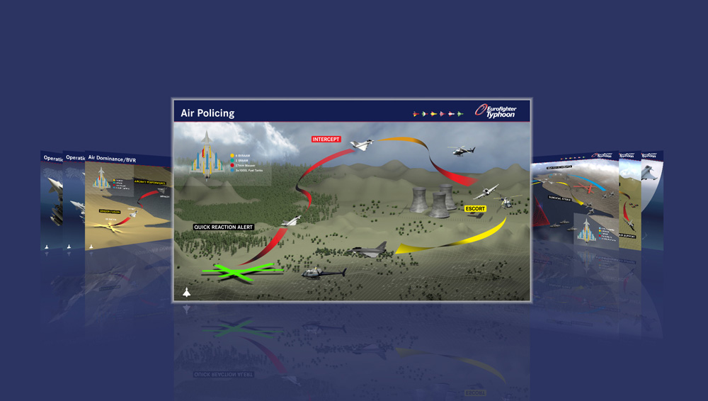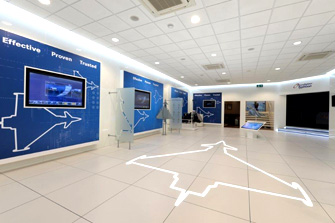 Permanent installation into a corporate demonstration room with eight rear-projection screens using synchronised high-definition video player sources, two 4-channel video services and Dolby 5.1 surround sound system. The whole room is controlled by a web-based interface to a control program using a hand-held wireless device.
