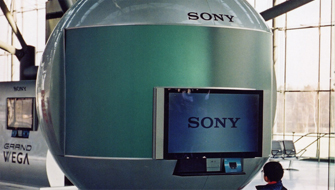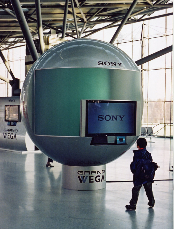 A 170º cylindrical rear projection screen, mounted in a fibre glass sphere. Two projectors fed from syncronised DVDs, soft edged in the production of the video footage with a third screen set into the main screen.