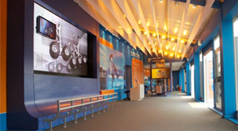This image shows 3 LED screens on the roof of the structure and one set in to the glass frontage.